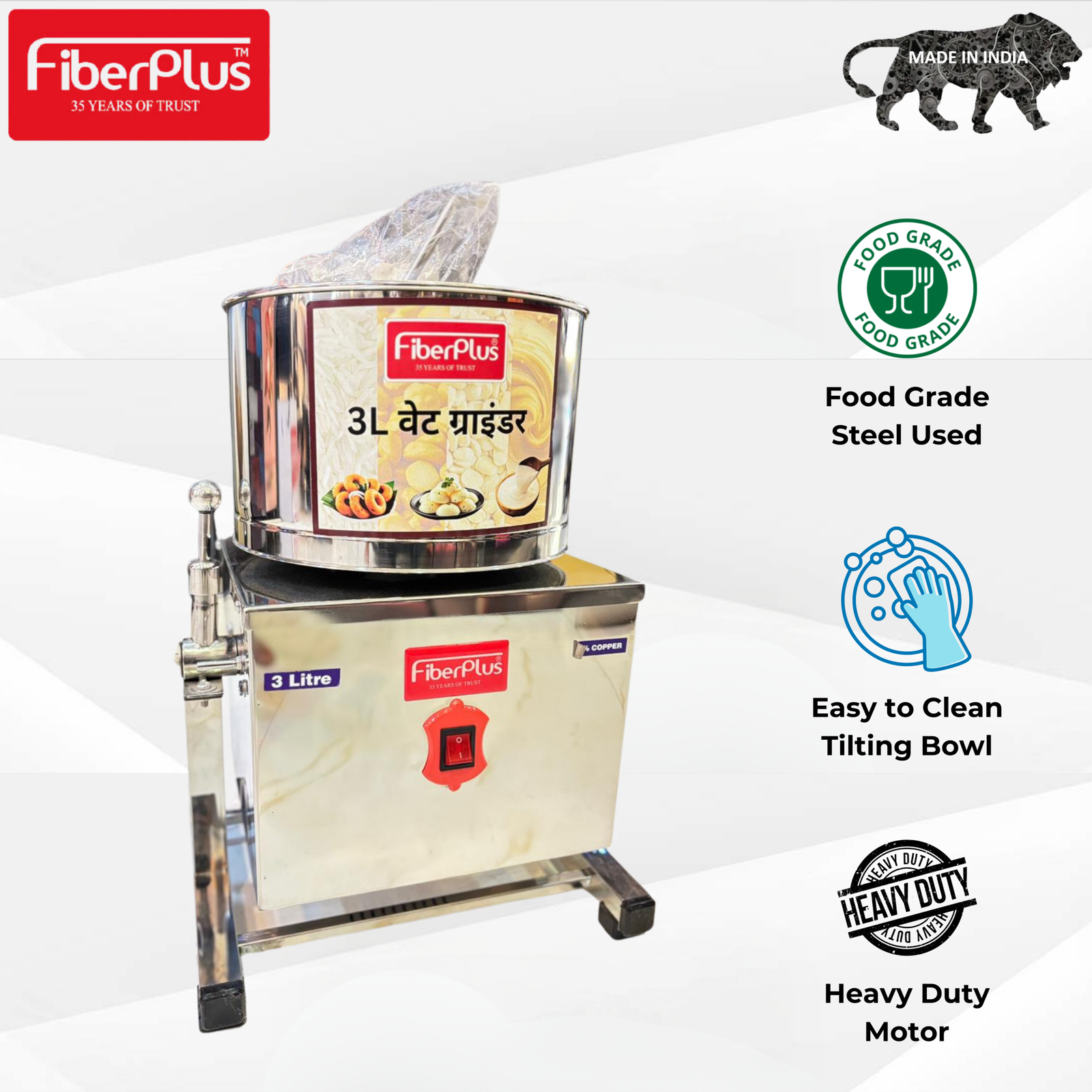 The Ultimate Solution for Authentic Batter! Say goodbye to the back-straining task of lifting heavy drums. The Fiberplus Tilting Wet Grinder is engineered for maximum convenience and durability. With 35 years of manufacturing expertise, we have perfected the balance between high-speed grinding and temperature control to ensure your batter never loses its natural nutrients or flavor.